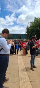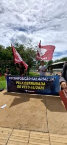 A uma só voz, os servidores e servidoras entoaram a palavra de ordem: “veto 45, derruba já”, demonstrando também em faixas e cartazes a insatisfação com o veto do Executivo à recomposição salarial nos anos de 2027 e 2028.