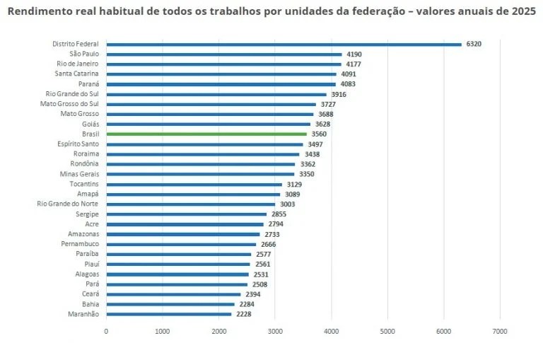 O valor anual do rendimento real dos trabalhadores brasileiros foi de 3.560 reais. No ano anterior, a média foi de 3.440 reais. Por região do País, o rendimento real habitual também reflete as desigualdades, registrando um volume acima dos 6 mil reais no DF e abaixo dos 2.500 reais no Maranhão. Confira a comparação: