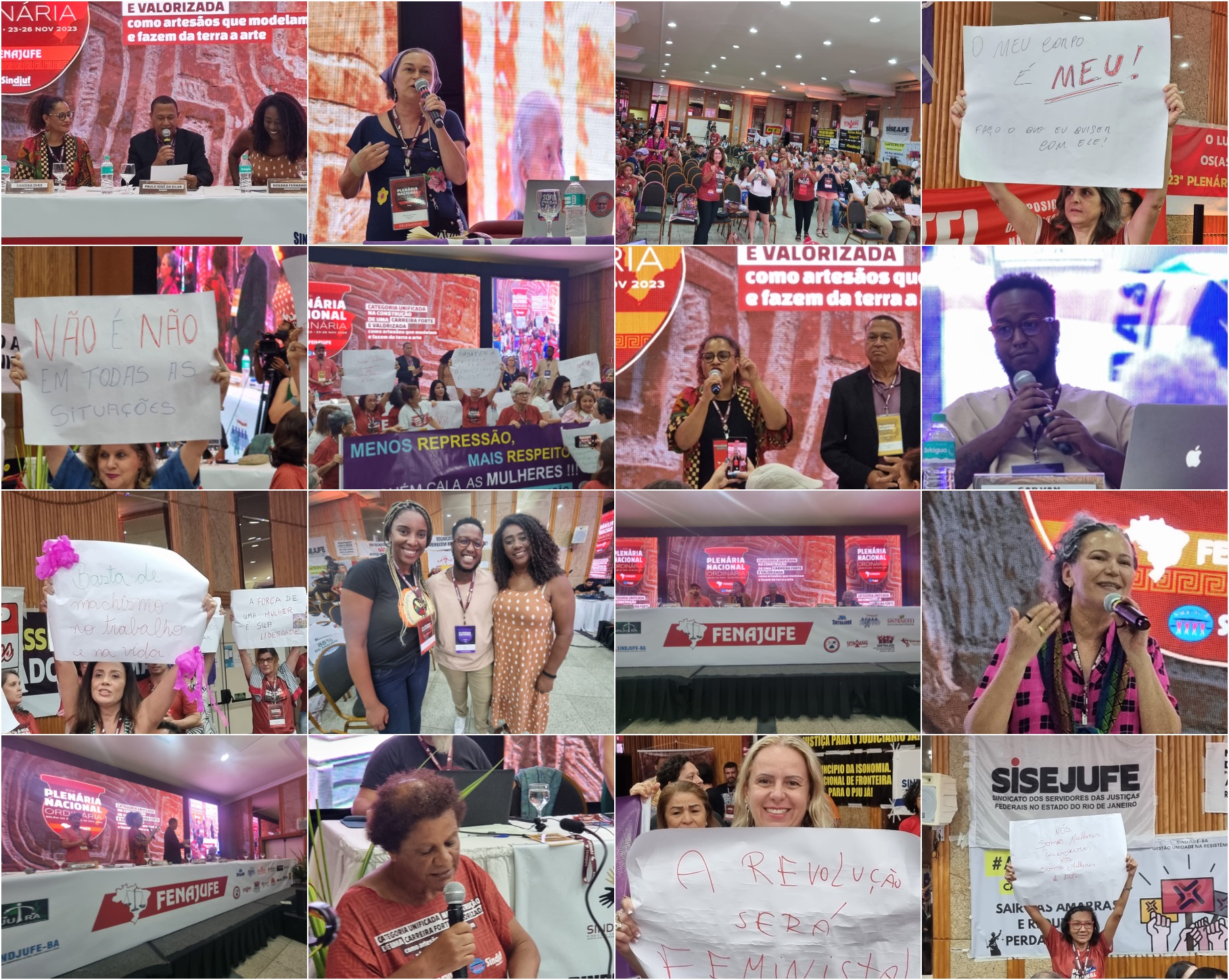 Temas fortes e polêmicos marcaram o segundo dia de debates da XXIII Plenária Nacional. Após “organização sindical” e a tão esperada discussão sobre carreira, na parte da tarde o protagonismo foi das mulheres. A mesa temática foi composta pela coordenadora Sandra Dias e os coordenadores Jaílson Laje e Paulo José, representando o “Coletivo de Pretas e Pretos da Fenajufe” e a “Coordenação de Opressões”, criados no 11º Congrejufe, ocorrido em 2022.