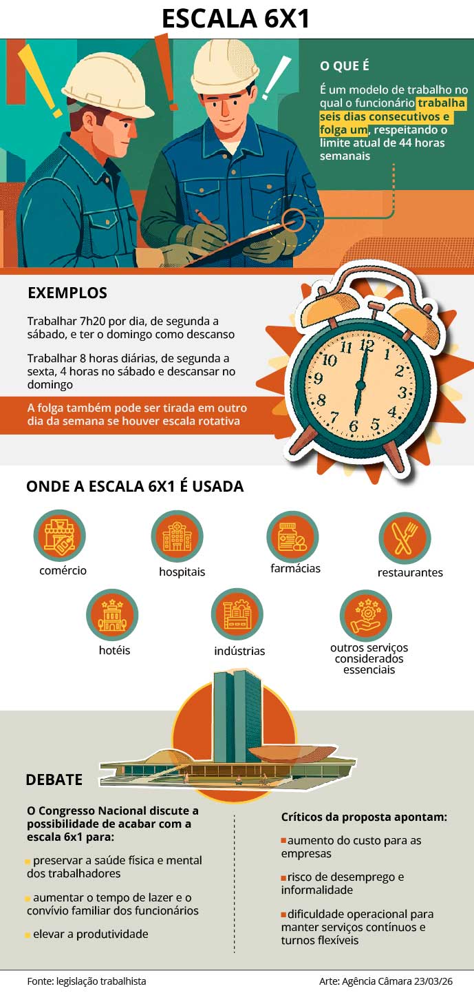 O presidente da Câmara, Hugo Motta (Republicanos-PB), criou uma comissão especial para analisar duas propostas de emenda à Constituição (PECs) que reduzem a jornada de trabalho no país (PEC 221/19 e PEC 8/25). Na prática, as PECs acabam com a escala de seis dias de trabalho por um de descanso (6×1).