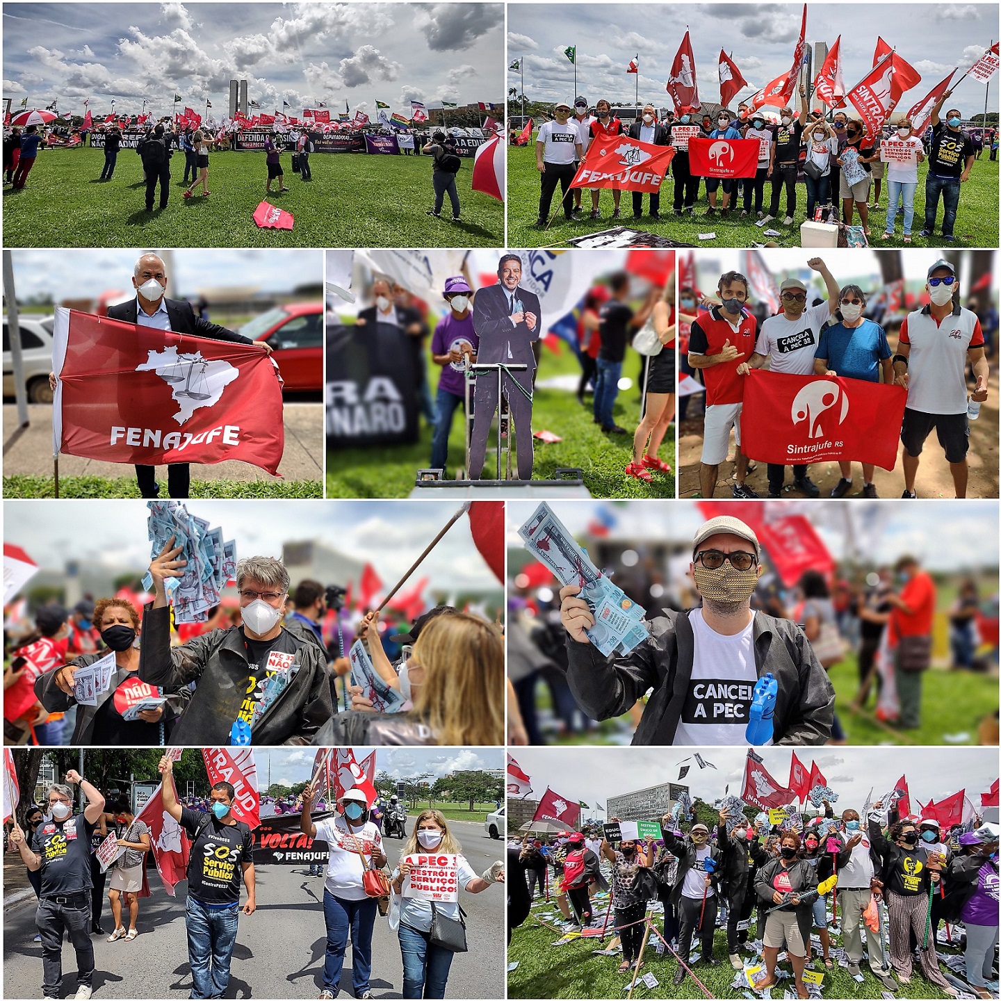 A concentração dos dirigentes ocorreu cedo no Espaço do Servidor e, de lá, seguiram pela Esplanada até a Alameda das Bandeiras onde denunciaram a compra de votos pela aprovação das propostas do governo BolsoGuedes com a utilização do “orçamento secreto”.