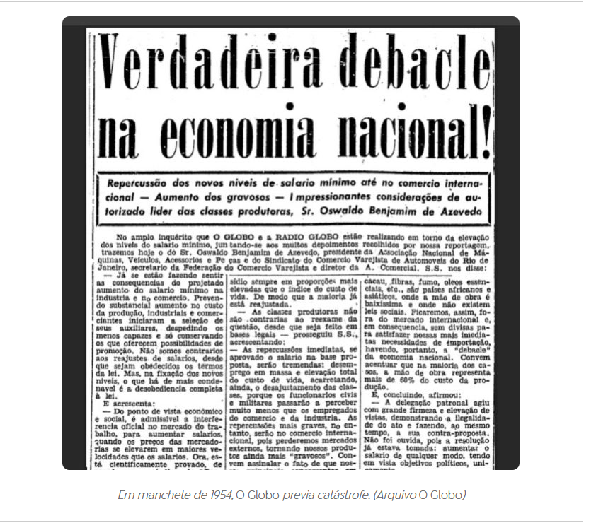 Getúlio promulgou o novo salário mínimo em 1954. Era o dobro: de 1.200 cruzeiros para 2.400 cruzeiros. No entanto, sua entrada em vigor, prevista para maio, só aconteceu em julho. O atraso se deveu a pressões dos empresários – federações do setor entraram com recurso junto ao Supremo Tribunal Federal (STF) e setores da imprensa se opuseram com virulência. Jornais chegaram a prever demissões em massa e “debacle” da economia nacional. A pressão contra Getúlio vinha de diversas frentes. O presidente cometeu suicídio em agosto.