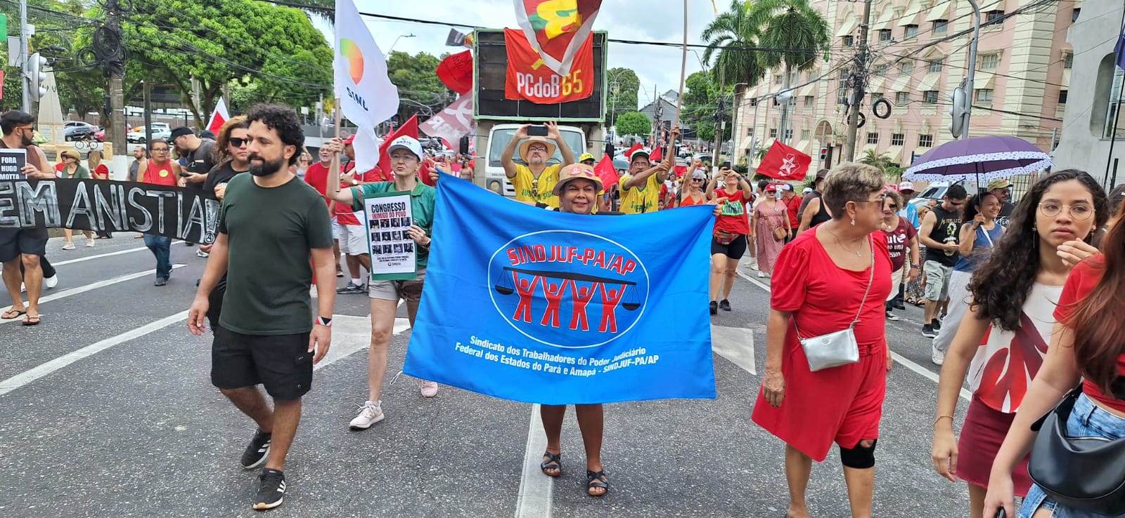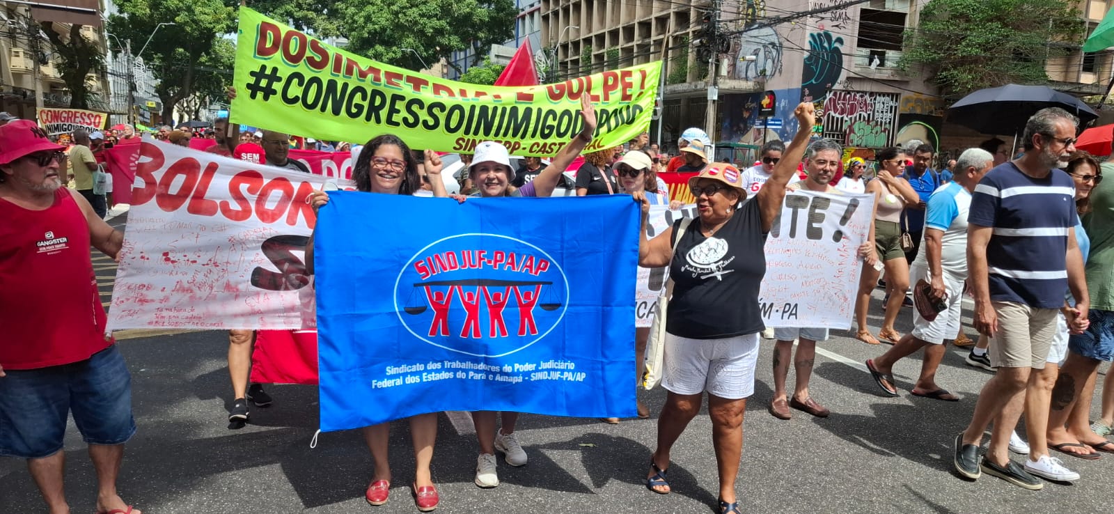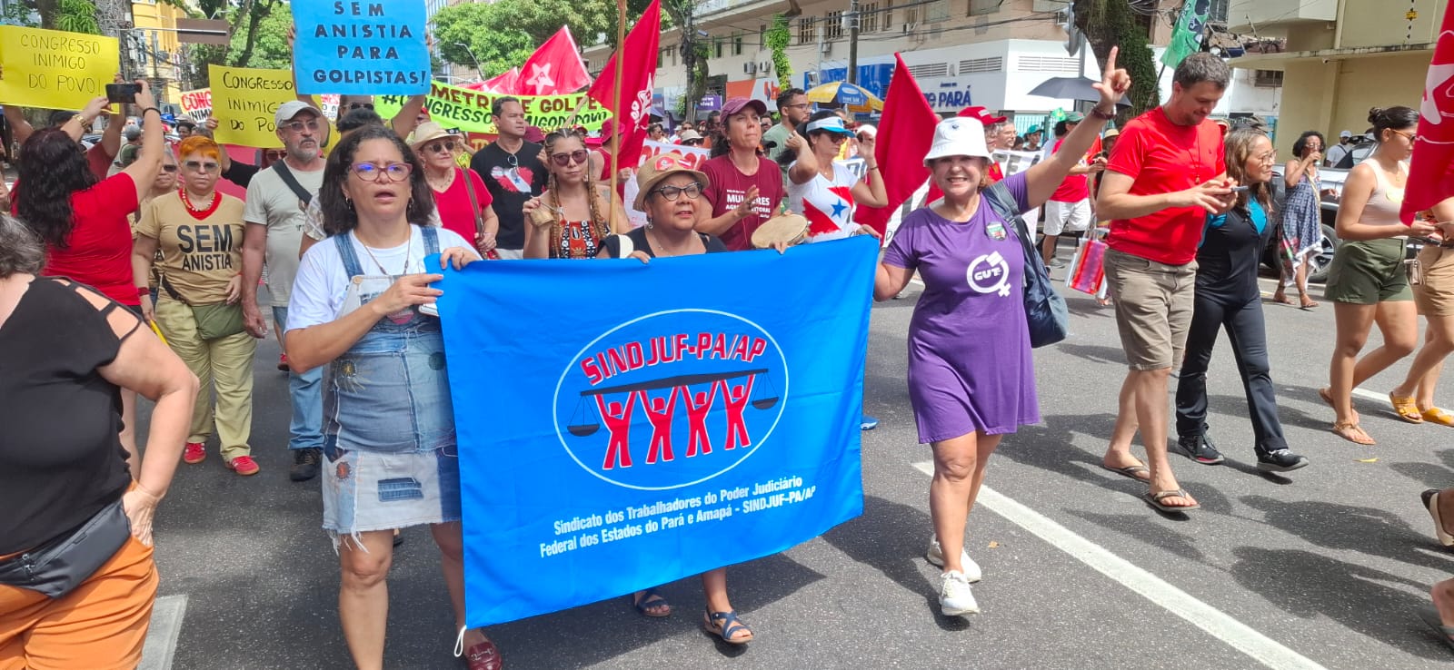 Representantes do Sindjuf-PA/AP participaram, na manhã desse domingo (14), da manifestação pública, convocada em todo Brasil, pelas Frentes Brasil Popular e Povo Sem Medo, com o mote “Sem anistia para golpistas”. O ato que, em Belém, saiu da Escadinha da doca e seguiu até a praça da República, reuniu milhares de pessoas em protesto contra projetos aprovados pelo Congresso Nacional que fragilizam a democracia e favorecem os envolvidos nos atos golpistas de janeiro de 2023.